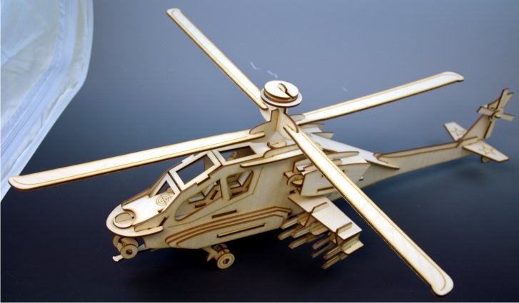Unique 3-D Apache Helicopter Puzzle with working parts. Made from 100% Baltic wood, little or no gluing neccessary. Recommended for age 7yrs. and up.