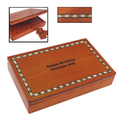 This classic game of dominoes is housed in a beautiful Birch Bow with inlaid lid a wonderful gift for any occasion. Engraving reveals a warm brown tone and customizing the Domino Set. This set is a Double Six Dominoes Set which is the most popular type of domino set. Double six sets have 28 Dominoes, with zero to six dots on each half. Dimensions 7 ¾” x 4 7⁄8” x 1 5⁄8” Price:$57.00 **Photo, logo, & clipart can be uploaded after purchase is completed**